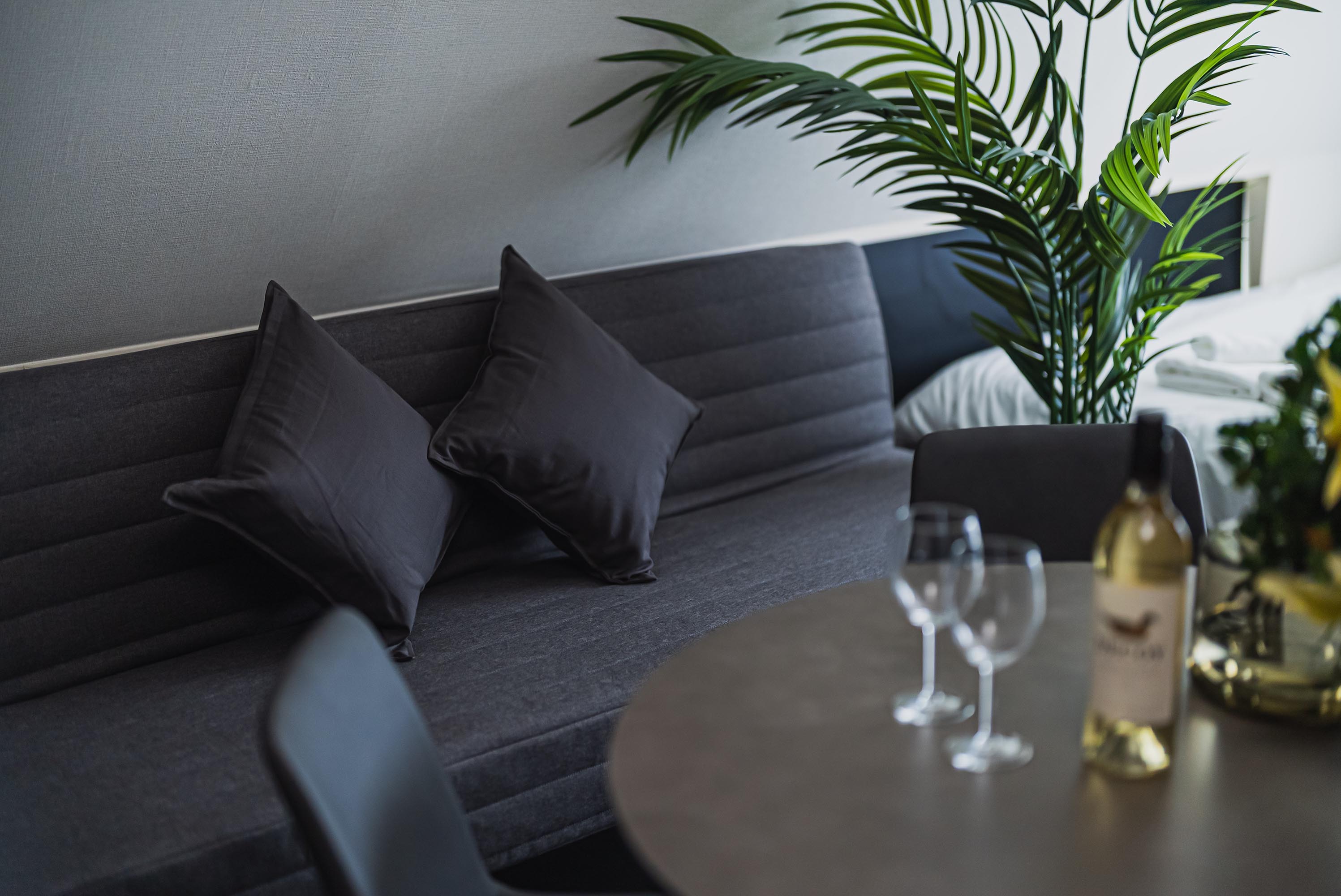The suite features a modern interior, Wi-Fi, and carefully selected amenities for a relaxing stay.